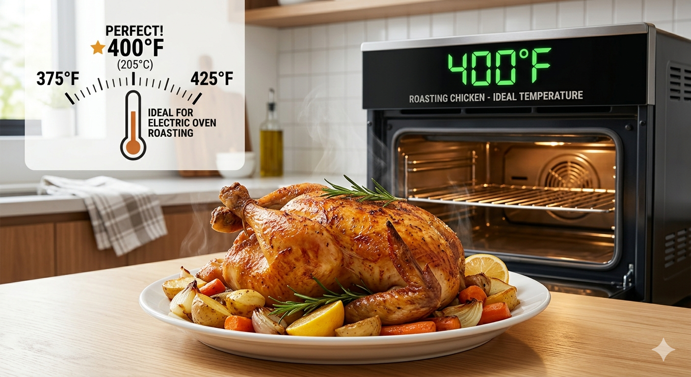 Bezpečnost potravin vyžaduje vnitřní teplotu 165 °F , bez ohledu na použitou teplotu trouby. Zatímco pražení při 400 °F je „sladkým místem“ pro texturu, teplota pece je pouze prostředkem k dosažení bezpečného vnitřního cíle. V elektrické troubě musíte být opatrní s velkými ptáky (nad 5 liber); mohou vyžadovat nižší teplotu 375 °F, aby se zajistilo, že se střed propeče, než se pokožka spálí.